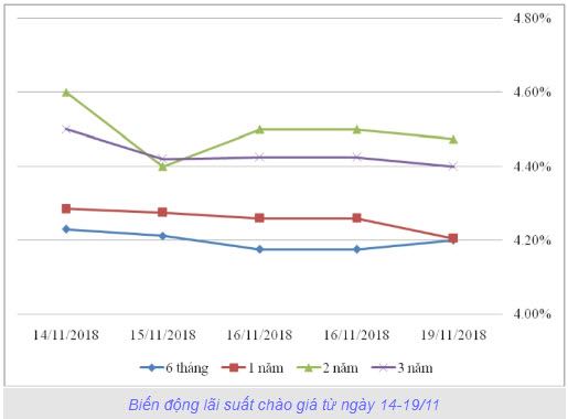 Trong phiên, lãi suất chào tại các kỳ hạn 3 tháng, 7 năm và 30 năm không đổi so với phiên gần nhất. Lãi suất chào tại các kỳ hạn 6 tháng, 1 năm, 2 năm, 3 năm, 5 năm, 7-10 năm và 20 năm giảm từ 2 đến 42 điểm cơ bản so với phiên gần nhất. Lãi suất chào tại các kỳ hạn 9 tháng, 3-5 năm, 5-7 năm, 10 năm, 10-15 năm và 15 năm tăng từ 1 đến 10 điểm cơ bản so với phiên gần nhất.