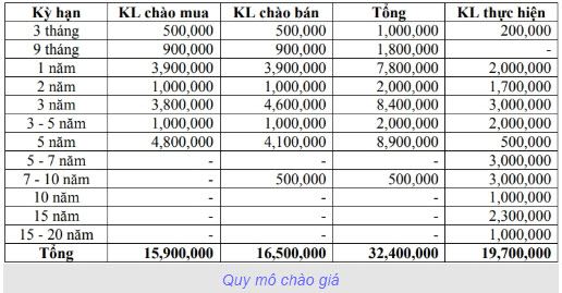 Giao dịch trong ngày được thực hiện tại các kỳ hạn 3 tháng, 1 năm, 2 năm, 3 năm, 3-5 năm, 5 năm, 5-7 năm, 7-10 năm, 10 năm, 15 năm và 15-20 năm, với tổng khối lượng thực hiện đạt 19,7 triệu trái phiếu.