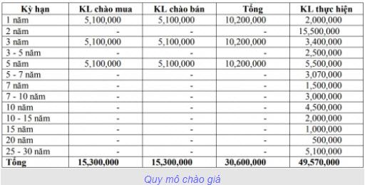 Giao dịch trong ngày được thực hiện tại các kỳ hạn 1 năm, 2 năm, 3 năm, 3-5 năm, 5 năm, 5-7 năm, 7 năm, 7-10 năm, 10 năm, 10-15 năm, 15 năm, 20 năm và 25-30 năm với tổng khối lượng thực hiện đạt 49,57 triệu trái phiếu.