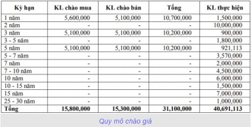 Giao dịch trong ngày được thực hiện tại các kỳ hạn 1 năm, 2 năm, 3 năm, 3-5 năm, 5 năm, 5-7 năm, 7 năm, 7-10 năm, 10 năm, 10-15 năm, 15 năm và 25-30 năm, với tổng khối lượng thực hiện đạt khoảng 40,69 triệu trái phiếu.