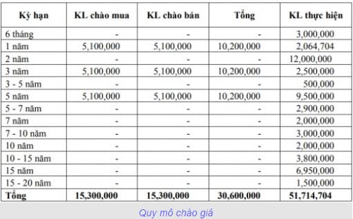 Giao dịch trong ngày được thực hiện tại các kỳ hạn 6 tháng, 1 năm, 2 năm, 3 năm, 3-5 năm, 5 năm, 5-7 năm, 7 năm, 7-10 năm, 10 năm, 10-15 năm, 15 năm và 15-20 năm, với tổng khối lượng thực hiện đạt khoảng 51.71 triệu trái phiếu.