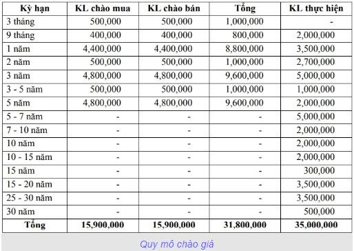 Giao dịch trong ngày được thực hiện tại các kỳ hạn 9 tháng, 1 năm, 2 năm, 3 năm, 3-5 năm, 5 năm, 5-7 năm, 7-10 năm, 10 năm, 10-15 năm, 15 năm, 15-20 năm, 25-30 năm và 30 năm với tổng khối lượng thực hiện đạt 35 triệu trái phiếu.