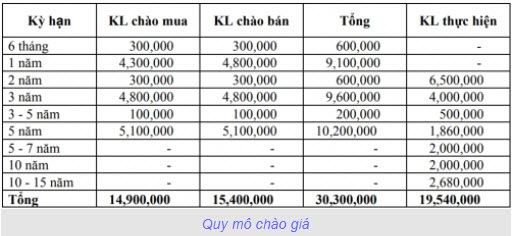 Giao dịch trong ngày được thực hiện tại các kỳ hạn 2 năm, 3 năm, 3-5 năm, 5 năm, 5-7 năm, 10 năm và 10-15 năm, với tổng khối lượng thực hiện đạt 19,54 triệu trái phiếu.