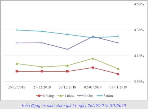 Lãi suất thực hiện tại kỳ hạn 2 năm, 3 năm, 5-7 năm, 10 năm giảm 3 đến 15 điểm cơ bản so với phiên gần nhất.