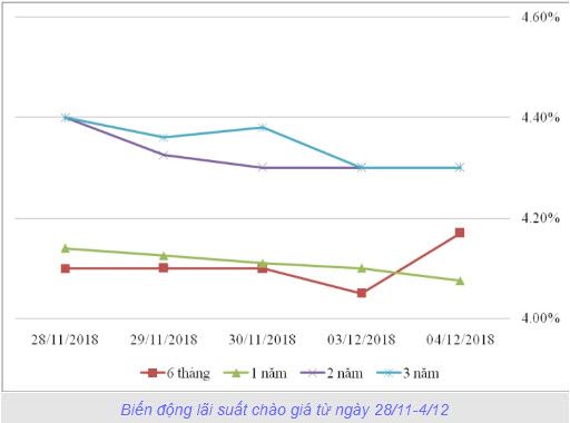 Trong phiên giao dịch trái phiếu Chính phủ (TPCP) ngày 4/12/2018, thị trường có xu hướng chào bán, trong đó kỳ hạn 5 năm có khối lượng chào bán lớn nhất, đạt 4,9 triệu trái phiếu.