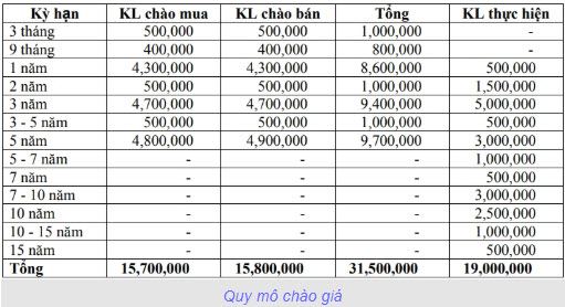 Giao dịch trong ngày được thực hiện tại các kỳ hạn 1 năm, 2 năm, 3 năm, 3-5 năm, 5 năm, 5-7 năm, 7 năm, 7-10 năm, 10 năm, 10 -15 năm và 15 năm, với tổng khối lượng thực hiện đạt 19 triệu trái phiếu.
