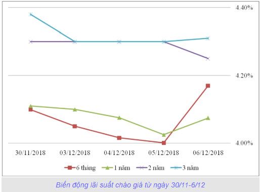 Trong phiên giao dịch trái phiếu Chính phủ (TPCP) ngày 6/12/2018, thị trường có xu hướng chào mua và chào bán cân bằng, trong đó kỳ hạn 3 năm và 5 năm có khối lượng chào mua, chào bán lớn nhất, đạt 4,7 triệu trái phiếu.