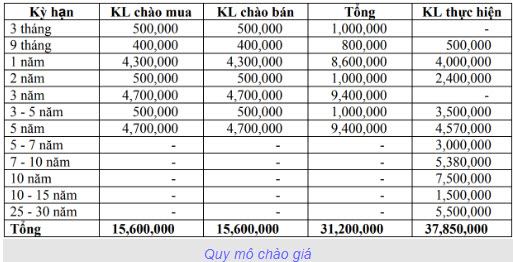Giao dịch trong ngày được thực hiện tại các kỳ hạn 9 tháng, 1 năm, 2 năm, 3-5 năm, 5 năm, 5-7 năm, 7-10 năm, 10 năm, 10 -15 năm và 25-30 năm, với tổng khối lượng thực hiện đạt hơn 37,85 triệu trái phiếu.