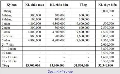Giao dịch trong ngày được thực hiện tại các kỳ hạn 3 tháng, 1 năm, 2 năm, 3 năm, 3-5 năm, 5 năm, 5-7 năm, 7-10 năm, 10 năm , 10-15 năm 25-30 năm, với tổng khối lượng thực hiện đạt 32,34 triệu trái phiếu.