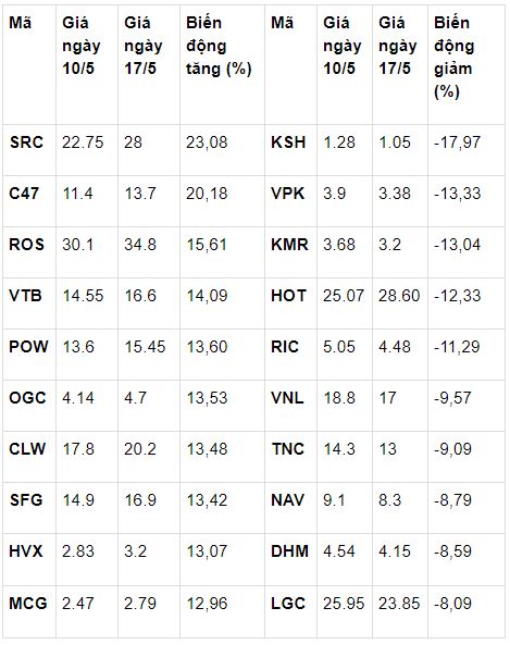 Top 10 cổ phiếu tăng/giảm mạnh nhất trên UpCoM tuần từ 10/5 đến 17/5: