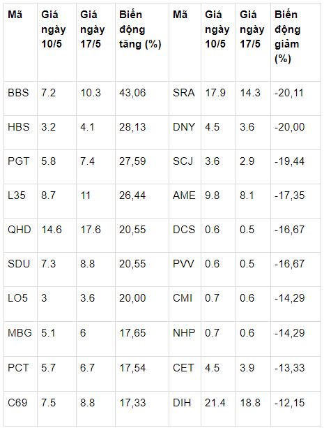 Top 10 cổ phiếu tăng/giảm mạnh nhất trên sàn HNX tuần từ 10/5 đến 17/5: