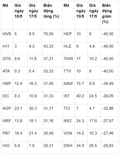 Top 10 cổ phiếu tăng/giảm mạnh nhất trên sàn HOSE tuần từ 10/5 đến 17/5: