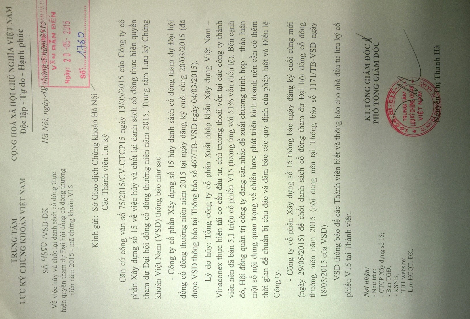 V15 thông báo ngày đăng ký cuối cùng mới là ngày 29/05/2015 để chốt danh sách cổ đông tham dự ĐHCĐ thường niên năm 2015.
