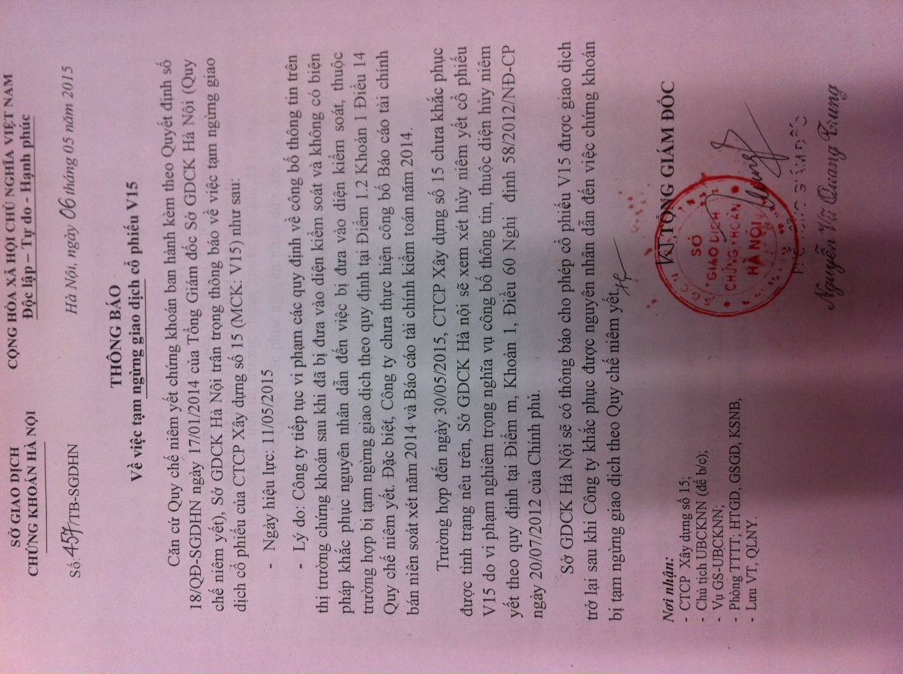 Sở sẽ có thông báo cho phép cổ phiếu V15 được giao dịch trở lại sau khi Công ty khắc phục được nguyên nhân dẫn đến việc chứng khoán vị tạm ngừng giao dịch theo Quy chế niêm yết.