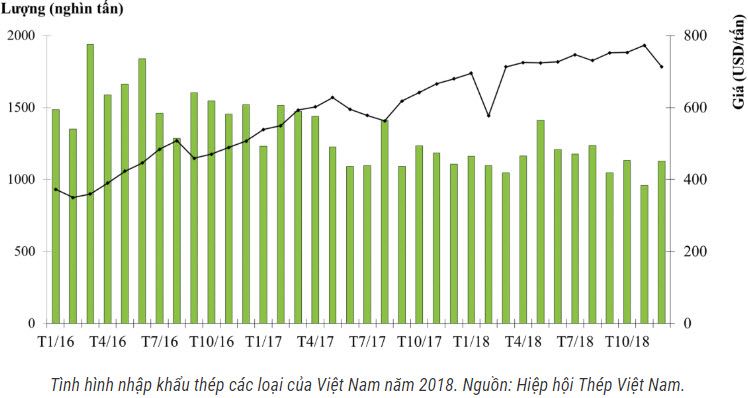 VSA cho biết trong năm 2018, nhập khẩu thép thành phẩm từ Trung Quốc có xu hướng giảm, đạt gần 6,27 triệu tấn và giảm 10% về lượng. Tỷ trọng thép nhập khẩu từ quốc gia này theo đó giảm về 46,3% tổng lượng thép thành phẩm nhập khẩu.