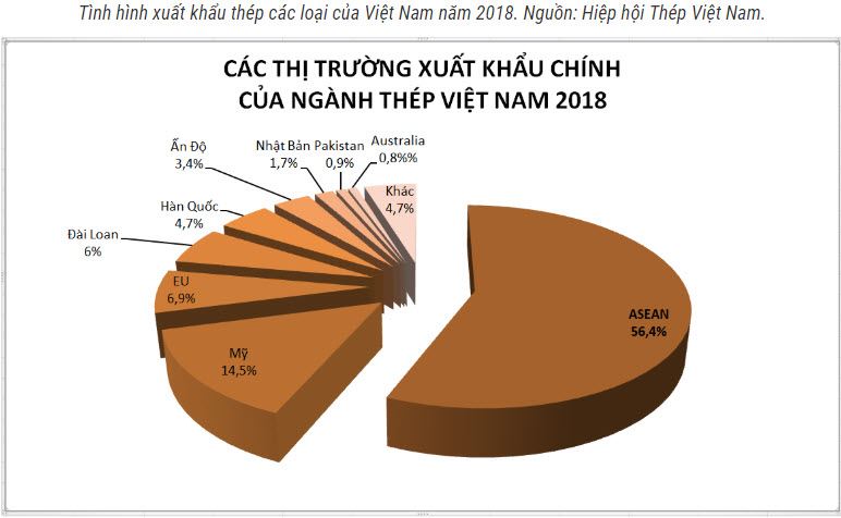 Ở chiều ngược lại, xuất khẩu sắt thép thành phẩm và bán thành phẩm đạt hơn 7,8 triệu tấn trong năm ngoái, tăng 40% về lượng và thu về hơn 5,7 tỷ USD. Trong đó, ASEAN vẫn là thị trường xuất khẩu chính, với lượng xuất khẩu thép thành phẩm hơn 3,5 triệu tấn thép, chiếm tới hơn 56% tổng lượng thép thành phẩm xuất khẩu của Việt Nam trong năm 2018.