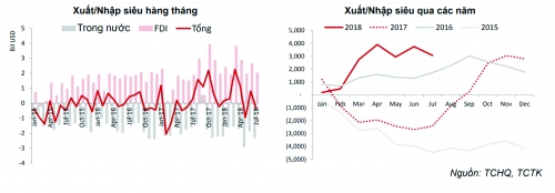 Trong bối cảnh cả xuất khẩu và nhập khẩu đều giảm tốc, nhập siêu đã quay trở lại do lượng xuất siêu của khối FDI giảm trong khi nhập siêu của khối trong nước vẫn đứng ở mức cao. Theo đó, xuất siêu của khối FDI trong tháng 7 là 2 tỷ USD, thấp hơn mức trung bình 6 tháng đầu năm là 2,6 tỷ USD, trong khi nhập siêu của khối trong nước là 2,3 tỷ USD, cao hơn trung bình 6 tháng là 2 tỷ USD.